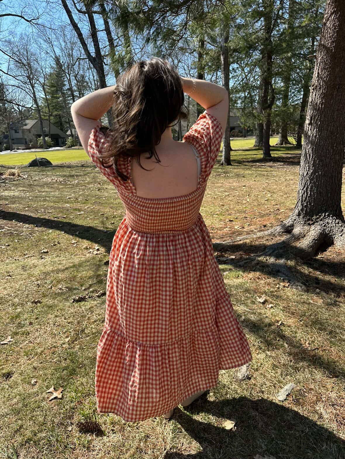 This cherry red gingham midi dress features a square neckline, pockets, smocked bust, and puff sleeves. This dress is made up of 100% cotton.