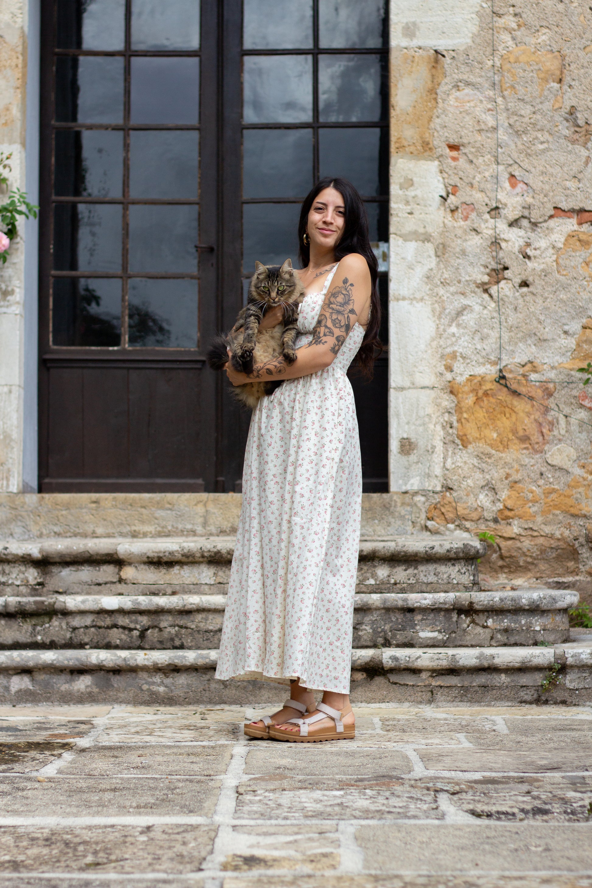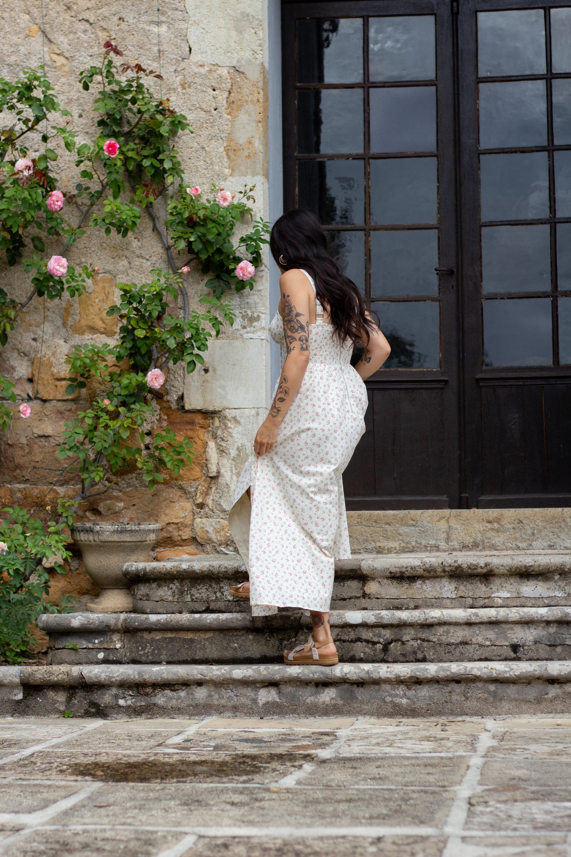 Our romantic maxi L'Amour au Château Dress features a sweetheart neckline, gathered bust, delicate pink floral print, adjustable shoulder straps, hidden side pockets, left leg slit, bust tie detail, back zipper and smocked back panel and is fully lined. This dress is made up of 100% Cotton and the lining is 100% Rayon.